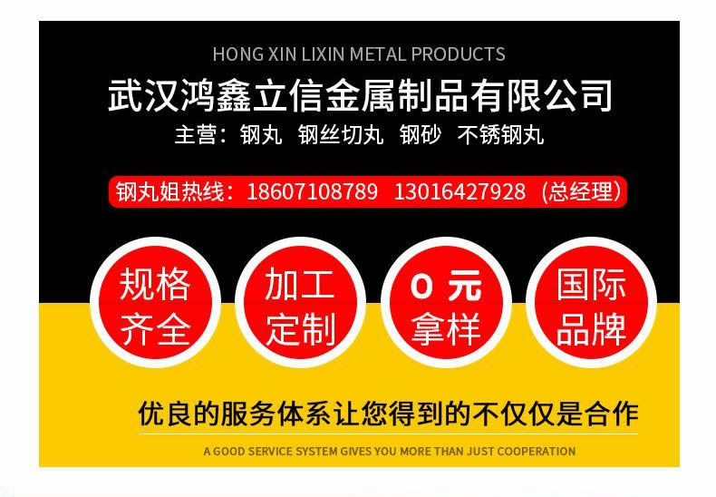 武漢鴻鑫立信金屬制品有限公司主要從事鋼丸、鋼絲切丸、鋼砂等除銹防腐耗材的生產(chǎn)和銷售。公司所有產(chǎn)品均通過ISO9001 **質(zhì)量認(rèn)證,2014年更獲得了第三屆中國金屬磨料行業(yè)**具影響力品牌-華尊獎。